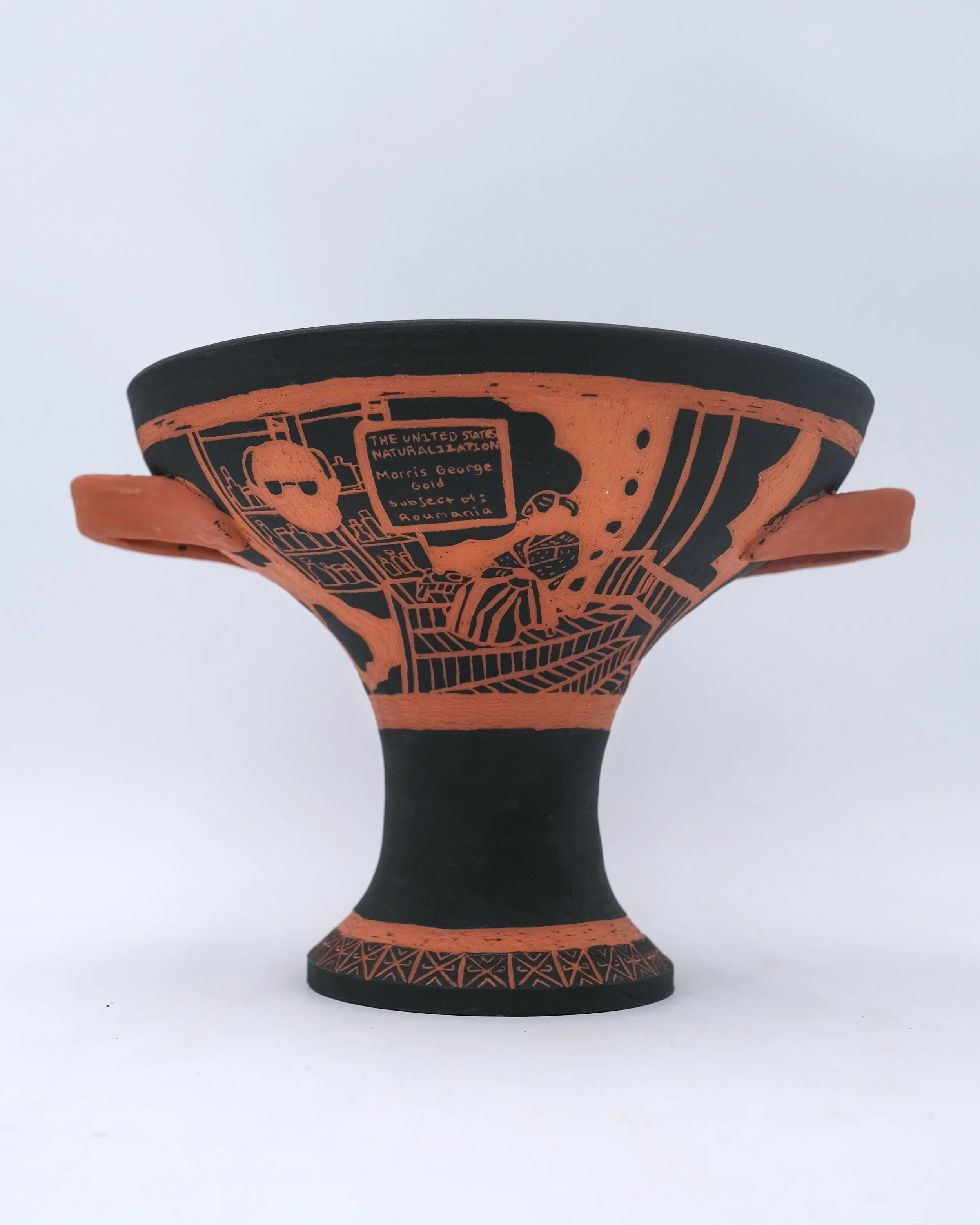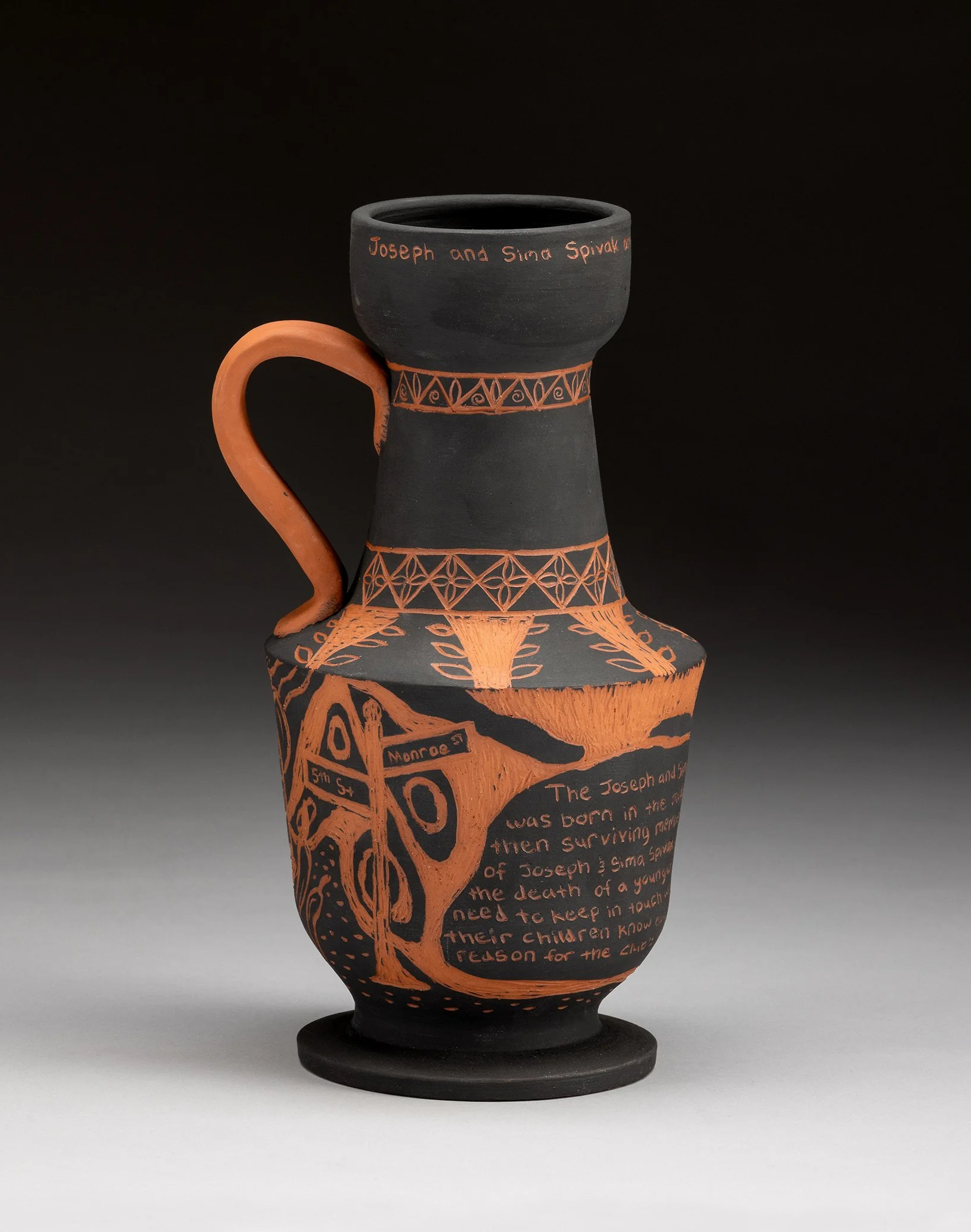 The first vessel focuses on my great-great-grandparents, Joseph and Sima Spivak. They immigrated to Philadelphia from Russia in the summer of 1905. This vessel incorporates imagery of their small South Philly grocery store, the location of their first home in Philadelphia, traditional Russian folk patterning, and a written excerpt from a document. This excerpt details the monthly family meetings held among their twelve children (well, eleven, since one passed). The inspiration for these meetings stemmed from the siblings' starting to sprawl and a strong desire to make sure their children knew each other. Each month, the family would gather at the selected meeting place, go around the table to talk about the happenings in each person’s life, and the family member who was elected secretary would write all of this information down in what is known in my family as “The Minutes.” We still have these handwritten documents to this day.