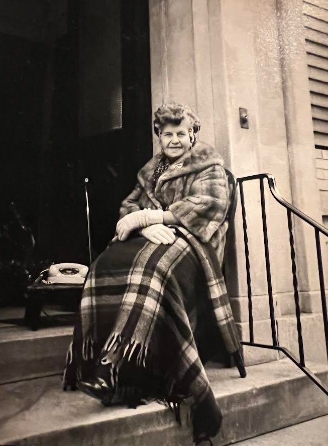 The other side is Morris and Sadie Gold, my grandmother’s parents. While Harry and Bess were from Russia, Morris was born in Romania. He was a pharmacist, which is why an old school pharmacy is pictured behind his portrait, along with his naturalization certificate next to him. The portrait of Sadie shows her sitting at the top of her steps at Chestnut & 20th. Sadie had “manic depressive disorder,” which is what they called bipolar in her time. At the time, the only medication prescribed for this was Lithium. However, Sadie was allergic. She lived her life unmedicated. One story my mom always told me growing up was her setup at the top of her steps. She would take out a chair, a table with her telephone, curlers in, fur coat and gloves on, and often some snacks like her deviled eggs, and sit out on her stoop to talk to people as they walked by. We are so lucky to have a photo of this incredible scene.